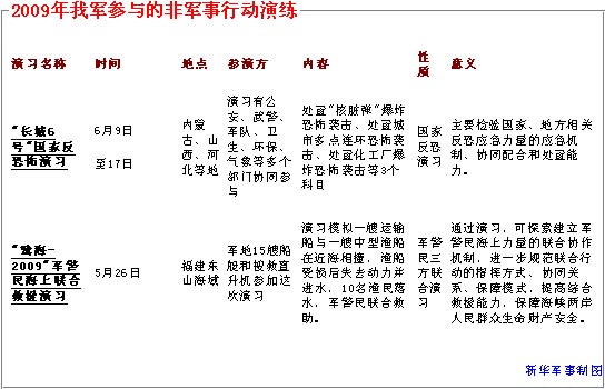 2009年中國軍隊參與了一些非軍事行動演練,規(guī)模較大的有"長城6號"國家反恐怖演習(xí)和"鷺海-2009"軍警民海上聯(lián)合救援演習(xí)。