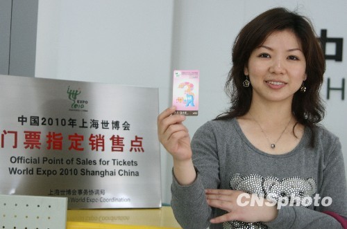 4月18日,在江西九江郵政局潯陽路營業廳門票銷售點,工作人員展示世博會門票。隨著5月1日上海世博會開幕日益臨近,世博會門票銷售升溫,目前該銷售點已累計銷售世博會門票千余張,其中2010年5月1日至5月3日指定日門票已銷售告罄。 中新社發 張海巖 攝