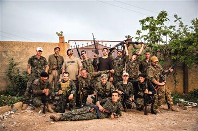 4月16日,敘利亞北部小鎮,來自多國的國際志愿軍戰士拍攝合影。