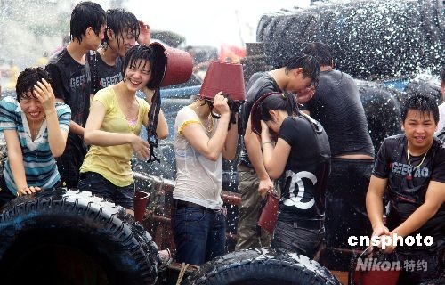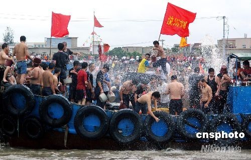 每年的端午節(jié),在閩南石獅的蚶江海邊,都會上演“海上潑水”的節(jié)慶好戲,來自遠近鄉(xiāng)里的漁家和海岸彼岸的鄉(xiāng)親,駕著各式各樣的小船,在海上競舟潑水,追逐嬉鬧。人們將潑出的水視為“幸福水”、“吉祥水”,讓此水淋個透,寓可消災驅邪,以求吉祥興旺,航海平安。