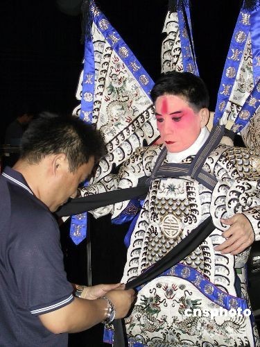 天津京劇院一行一百人七月十五日起在臺北戲劇院演出京劇好戲,包括新編得獎作品《媽祖》。這是自大陸居民赴臺旅游首發團離臺后,大陸來臺的最大陣容京劇團體,同時也創下兩個紀錄:是迄今人數最多的訪臺大陸京劇團組,超過一九九三年中國京劇院第一次組團訪臺時的九十七人;涵蓋京津滬等地十四位國家級演員,風格上囊括了京劇梅尚程裘眾派特色。圖為演出彩排前,工作人員在后臺幫助演員上妝。 中新社發 徐長安 攝