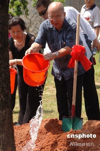 八月十四日下午,中國(guó)國(guó)民黨主席吳伯雄一行在福建永定縣高北土樓群的“土樓王”承啟樓前,植樹(shù)紀(jì)念此次祖地行。圖為吳伯雄夫婦為新種下的香樟樹(shù)澆水。 中新社發(fā) 鄭祚聲 攝