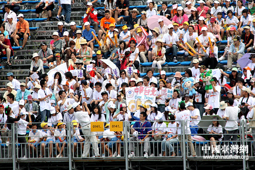 百余名臺(tái)灣青年組成聲勢(shì)浩大助威團(tuán)為女壘姑娘營(yíng)造“家一樣的”氣氛(攝影 李徽)