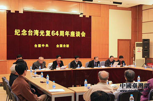由臺盟中央、全國臺聯共同舉辦的“紀念臺灣光復64周年座談會”現場。(中國臺灣網 董潔/攝)