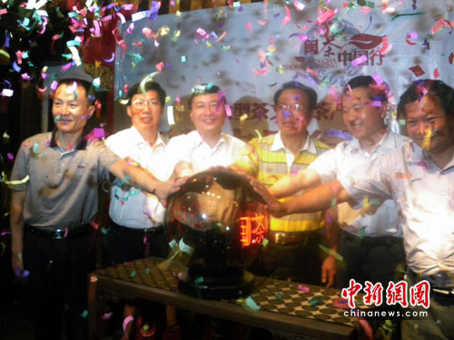 13日晚,“閩茶中國行”暨首站臺灣行啟動儀式在福州舉行。海峽茶業交流協會會長張家坤、中共福建省委宣傳部副部長蔡小偉等領導共同按下了啟動球。 中新網發 張羽 攝