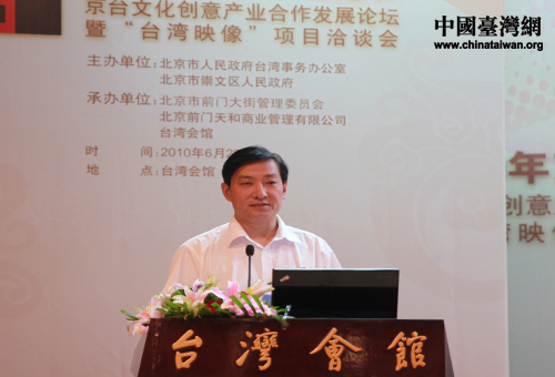 中國臺灣網(wǎng)6月22日北京消息 由北京市人民政府臺灣事務(wù)辦公室、崇文區(qū)人民政府主辦,北京市前門大街管理委員會、北京前門天和商業(yè)管理有限公司、臺灣會館承辦的 “2010年京臺文化節(jié)——京臺文化創(chuàng)意產(chǎn)業(yè)合作發(fā)展論壇暨‘臺灣映像’項目洽談會”,今天在重新開張的臺灣會館舉行。國臺辦交流局副局長嚴中洲、北京市臺辦主任馬玉萍、崇文區(qū)區(qū)長牛青山、北京市臺辦副主任黃塞溪、崇文區(qū)副區(qū)長周永明等領(lǐng)導出席了此次活動。臺北市文化創(chuàng)意產(chǎn)業(yè)參訪團、在京文創(chuàng)企業(yè)代表、北京臺資企業(yè)協(xié)會代表,以及來自臺北、上海等地的臺企代表等共100余人參加論壇活動。
