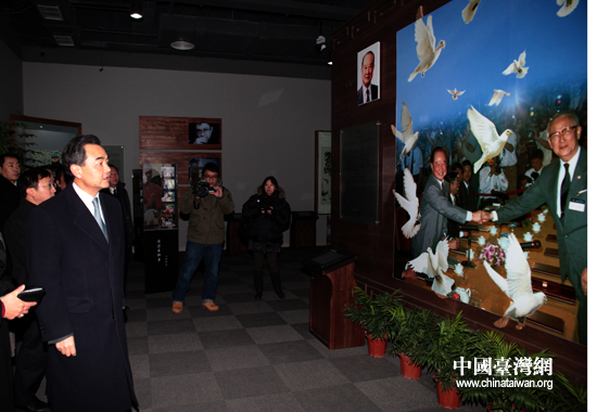 中國臺灣網12月24日上海消息 24日上午,中共中央臺辦主任王毅參觀了上海福壽園人文紀念博物館,并在展示汪老事跡與汪辜會談情景的汪道涵紀念墻前駐足。 (中國臺灣網 田云鵬 攝)