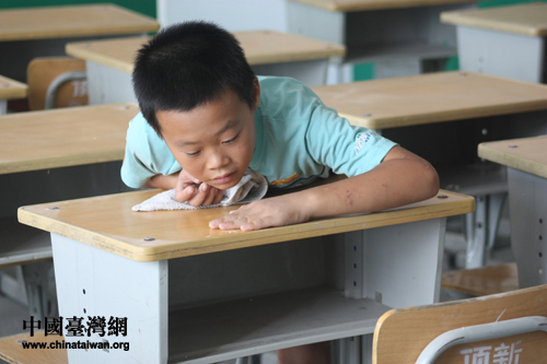 仔細擦去課桌上的灰塵,迎接新學期的到來。(中國臺灣網 王怡然 攝)