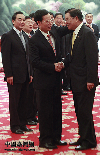 21日午間,中共中央政治局委員、中共天津市委書記張高麗在天津會見了參加第七次會談的兩岸兩會協商代表團的主要成員,中臺辦主任王毅陪同會見,圖為張高麗與江丙坤握手致意。(中國臺灣網 陳佳慧 攝)