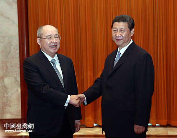 中共中央總書記習(xí)近平13日下午在北京人民大會(huì)堂會(huì)見了中國(guó)國(guó)民黨榮譽(yù)主席吳伯雄率領(lǐng)的國(guó)民黨大陸訪問(wèn)團(tuán)一行。(中國(guó)臺(tái)灣網(wǎng) 王偉 攝)