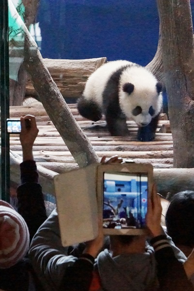 動(dòng)物園大門在9時(shí)開啟,正式迎接“圓仔”亮相的歷史性一刻。許多游客拔腿狂奔,跑向大貓熊館。9時(shí)10分,“圓仔”正式和大家見面。