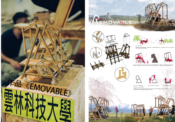 經過一上午的緊張評審,最后臺灣云林科技大學的作品《Removable》脫穎而出,斬獲金獎。該作品的設計理念是:以日常生活去發想,透過錯落的平臺,創造不同年齡層相互體會的空間感受。使用的木構架體為南方松,并在構架底下有設置推車,在不拆除的狀況下,能依使用者因應環境與景色做調整;而拆卸后,也能夠將所有桿件進行移動,隨時變成野餐的行動桌椅或幼童嬉戲的場所。
