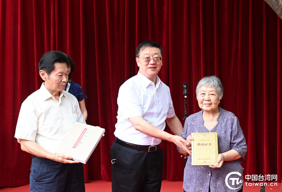 全國人大常委會委員、臺盟中央常務副主席李鉞鋒為捐贈者梁月心、張寧頒發收藏證書。(圖片來源:臺盟中央)
