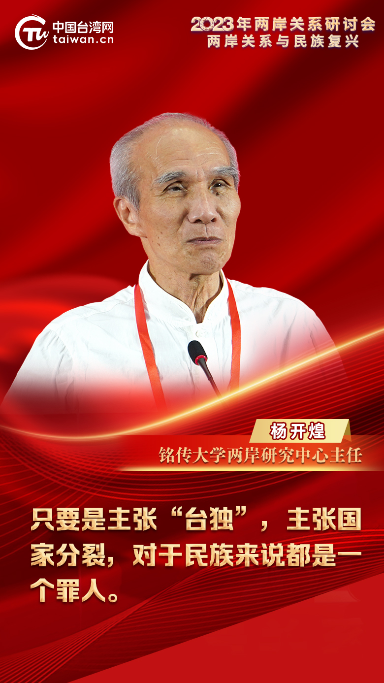 2023年兩岸關(guān)系研討會(huì)8月17日上午在四川成都開(kāi)幕。銘傳大學(xué)兩岸研究中心主任楊開(kāi)煌在致辭時(shí)表示,只要是主張“臺(tái)獨(dú)”,主張國(guó)家分裂,對(duì)于民族來(lái)說(shuō)都是一個(gè)罪人。