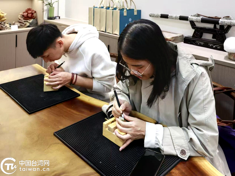 臺灣儷雅青揚交流協會參訪團成員在體驗印章雕刻。(中國臺灣網 發)