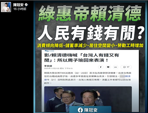 中國國民黨青年部前主任陳冠安評論稱,賴清德真是“綠惠帝”,根本是“何不食肉糜”翻版。他列舉數(shù)據(jù)表示,臺灣民眾儲蓄率已連續(xù)4年減少,2021年到2024年從25.23%下滑到23.73%。消費傾向從78.73%下降到76.27%,2024年的平均住宅坪數(shù)也創(chuàng)下2000年以來新低紀錄。民眾越來越窮,但有閑了嗎?他說,賴清德同樣錯得離譜。根據(jù)臺勞動部門數(shù)據(jù),2024年每人每月平均工時達169.2小時,創(chuàng)6年新高,而每人每月加班工時8.5小時,更是10年最高,“人民有錢嗎?”