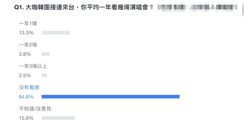 有臺灣媒體進行網(wǎng)絡投票調(diào)查臺灣民眾看演唱會的頻率,參與投票的3.18萬人之中,有64.8%表示沒看過。還有粉絲被媒體詢問是否因為“有錢又有閑”來看演唱會時表示,“也不是欸”,純粹是為了娛樂。