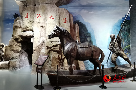 當年為幫助紅軍渡過烏江,漁民周世昌便用小木船給紅軍渡戰馬。圖為周世昌劃船渡戰馬雕塑。 人民網記者 黃玉琦攝