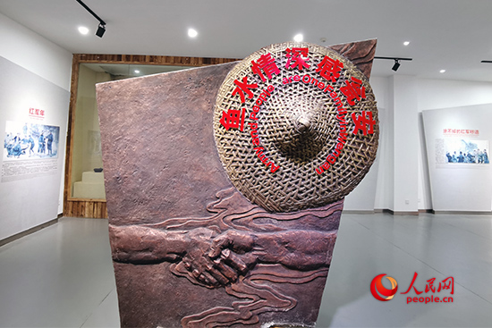 “一只手代表的是甕安人民,一只手代表的是紅軍,在斗笠之下,兩只手緊緊相握,體現的正是魚水深情!奔o念館講解員指著“魚水情深感甕安”的雕像說。圖為“魚水情深感甕安”雕塑。人民網記者 黃玉琦攝