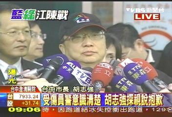 受傷警察意識清醒,在胡志強探視時還說“抱歉”。來源:臺灣TVBS電視臺