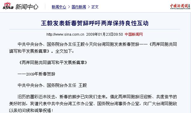中共中央臺辦、國務院臺辦主任王毅今天向臺灣同胞發表新春賀辭——《兩岸同胞共同譜寫和平發展新篇章》。全文如下: