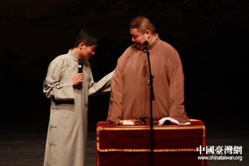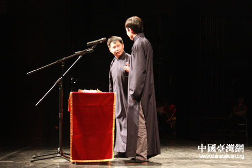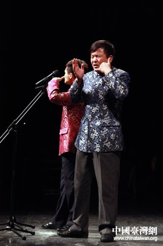 中國臺灣網5月18日嘉義消息 5月17日晚上,嘉義縣表演藝術中心迎來了“第十一屆京味文化——臺灣嘉義親情之旅”一行的表演藝術家、工藝美術大師們。應寧、王磊表演的《雙簧》,何云偉、李菁帶來的《學啞語》,李偉建、武賓經典段子《咨詢熱線》,以及由臺北曲藝團帶來的快板《雙鎖山》,相聲《地理圖之阿寶要脫團》,讓當晚嘉義縣表演藝術中心的觀眾從頭笑到尾。(記者 董潔 圖/文)
