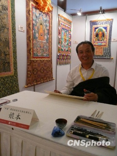 內容豐富多彩的大美青海臺灣行活動16日拉開帷幕。作為推動兩岸交流的一次重要活動,青海副省長王令浚16日在臺北圓山飯店主持一場推介會,期盼有更多的臺商到青海投資,更多的臺灣旅客到青海旅游觀光。圖為青海著名唐卡藝術家在現場為來賓繪畫。中新社發閆曉虹攝