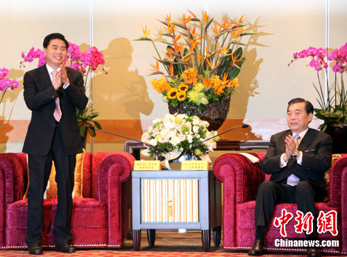 8月16日,廣東省省長(zhǎng)黃華華(左)率團(tuán)到臺(tái)北參加“臺(tái)灣·廣東周”活動(dòng)。他在與臺(tái)北世貿(mào)中心董事長(zhǎng)王志剛(右)及臺(tái)灣工商企業(yè)界人士會(huì)面時(shí)強(qiáng)調(diào),廣東的發(fā)展與臺(tái)灣同胞的大力支持分不開。中新社發(fā) 劉舒凌 攝