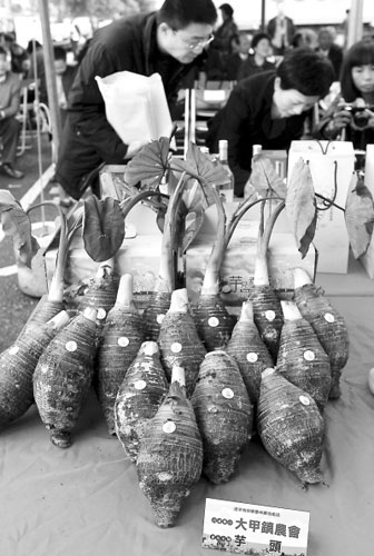 2月19日,“遼寧采購臺灣農(nóng)特產(chǎn)品簽約啟運儀式”在臺中果菜市場舉行,現(xiàn)場簽訂采購協(xié)議總金額約4000萬元新臺幣。首批裝滿臺中茂谷柑、蜂蜜等當?shù)貎?yōu)良農(nóng)特產(chǎn)品的5輛貨柜車隨即啟運,將由臺中港直接運往遼寧。圖為儀式現(xiàn)場展示的臺中特產(chǎn)大甲芋頭。新華社記者 宋立東攝