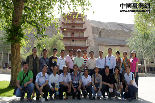 2012年海峽兩岸新聞媒體“陸上三峽行”采訪團(tuán)在敦煌莫高窟合影。(中國(guó)臺(tái)灣網(wǎng)發(fā))