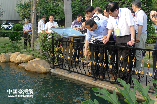 與會兩岸代表參觀臺資企業聯眾不銹鋼廠,圖為廠區利用冶鋼凈化水的生態魚塘(中國臺灣網 李徽 攝)