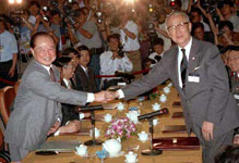 29日上午10點(diǎn)52分,汪道涵、辜振甫分別代表海協(xié)和海基會(huì)在《汪辜會(huì)談共同協(xié)議》等四項(xiàng)協(xié)議上,鄭重地簽署了自己的名字。對此,辜老先生感慨地表示,“今天上午簽署的協(xié)議,為兩岸事務(wù)性交流掀開了新的一頁”,“使兩岸關(guān)系跨出了歷史性的一步”,“為兩岸未來的發(fā)展打下了良好的基礎(chǔ)”,“對發(fā)展兩岸關(guān)系、兩岸交流秩序化將是一座里程碑”。