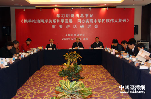 中國臺灣網(wǎng)12月17日北京消息 今天上午,全國臺灣研究會在此間召開研討會,來自北京、上海、廈門等全國各大高校、研究機(jī)構(gòu)的二十余位知名臺灣問題專家學(xué)者與會,就學(xué)習(xí)胡錦濤總書記《攜手推動兩岸關(guān)系和平發(fā)展 同心實現(xiàn)中華民族偉大復(fù)興》重要講話進(jìn)行了探討和交流。