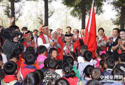 身著鮮艷民族服裝的臺灣阿里山鄒人部落鄉親一行15人在臺灣少數民族民意代表簡東明的帶領下來到南陽鄧州“臺灣村”,探訪300多年前遷居到此的宗親后裔!芭_灣村”村民們穿著節日盛裝,歡迎來自寶島臺灣的親人。