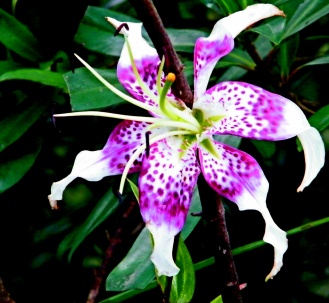 艷紅百合花如其名,在原生百合花中最艷麗動人,反卷后翻的白底花瓣帶著紅色斑點,花蕊往外伸出,遠望不像臺灣原生百合花,是日本人最喜歡的鹿子百合變種,有“最美麗的東亞百合”之稱。