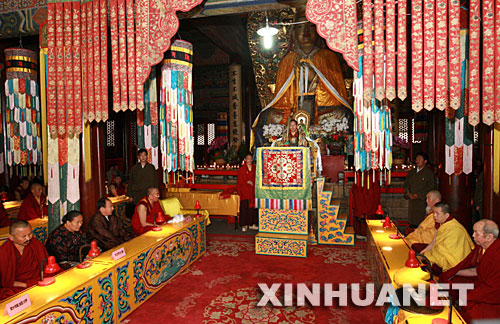 新華網(wǎng)北京5月21日電 第十一世班禪額爾德尼·確吉杰布21日在北京雍和宮主持為在四川汶川大地震中遇難同胞的祈愿法會。