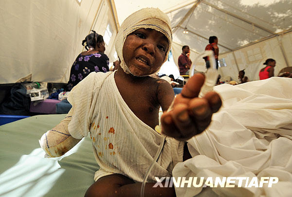 1月23日,在海地首都太子港,一名在地震中失去一只手的4歲兒童在臨時醫院中等待手術。新華社/法新