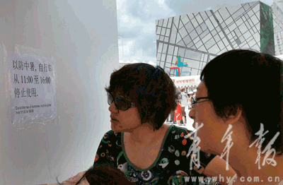 夏日炎炎,為了防止游客因為做劇烈運動,出汗過多而中暑,丹麥館(網上丹麥館)采取了自行車禁租借的措施。記者昨天在世博丹麥館排隊處看到,在醒目的位置貼出了“以防中暑,自行車從11點到16點停止使用”的告示。