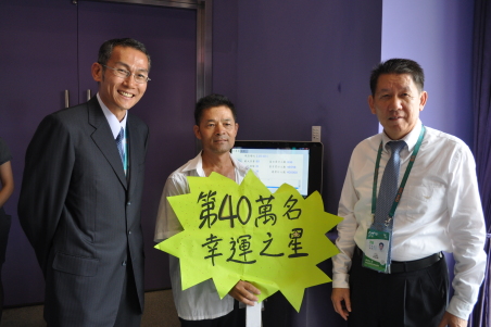 在現(xiàn)場的歡呼聲中,工作人員獻上“第40萬名幸運之星”的牌子,臺北館館長陳慶安也特別致贈臺北名產(chǎn)鳳梨酥、數(shù)碼相框、臺北國際花卉博覽會的邀請卡及花博一日劵二張等禮物給幸運的林金火先生。陳館長也不忘提醒大家,重要的是在上海世博會之后,臺北花博即將于11月6日展開,他邀請大家“相約臺北花博見!”,也歡迎大家到臺北觀光。同時陳館長也宣布同梯次參觀的游客通通有獎,每位都可以在互動體驗區(qū)拍攝臺北景點合成照,引起全場鼓掌。而臺北館陳館長也透露臺北館第50萬名幸運臺北館將會送出更多大獎。