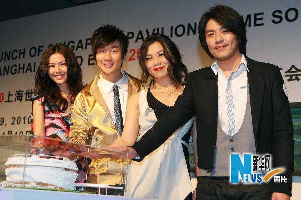 4月19日,新加坡歌手孫燕姿、林俊杰、蔡健雅、阿杜(從左至右)共同出席上海世博會新加坡館主題曲《感動每一刻》音樂電視的首發新聞發布會。新華社發(朱良城 攝)
