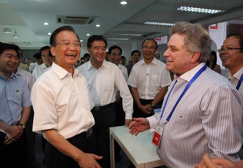 8月20日,溫家寶在中國(深圳)設計之都創意設計產業園調研時,與一家美國創意企業負責人交談,了解中外企業合作研發和生產情況。