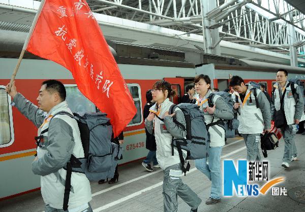 4月15日,醫療隊員正在登上列車。當日,重慶市由179人組成的首批醫療隊正式出發,乘專列趕赴青海地震災區。這支醫療隊由20家醫療機構的醫務人員組成,帶有30輛救護車和部分醫療救援藥品。另外,重慶市還有數支醫療隊正整裝待發。新華社記者 周衡義 攝