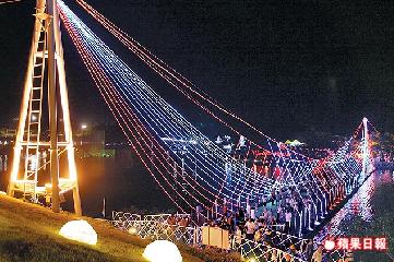 為慶祝七夕情人節(jié),主辦單位宜蘭縣政府特地在公園搭起由浮筒建造,長(zhǎng)65米、寬6米,橋梁纜繩以七彩LED管燈布置,可容納150對(duì)情侶同時(shí)度過(guò)的“鵲橋”。來(lái)源:臺(tái)灣《蘋果日?qǐng)?bào)》