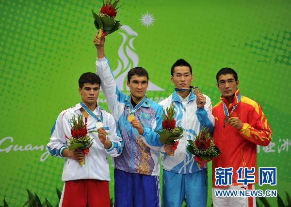 11月25日,冠軍哈薩克斯坦選手謝里克 薩皮耶夫(左二)、亞軍烏茲別克斯坦選手烏克塔姆忠 拉赫蒙諾夫(左一)、并列季軍蒙古國選手扎爾嘎勒 奧特根扎爾嘎勒(右二)和中國選手麥麥提圖爾孫瓊在頒獎儀式上。當日,第16屆亞運會拳擊項目男子69公斤級頒獎儀式舉行。新華社記者公磊攝