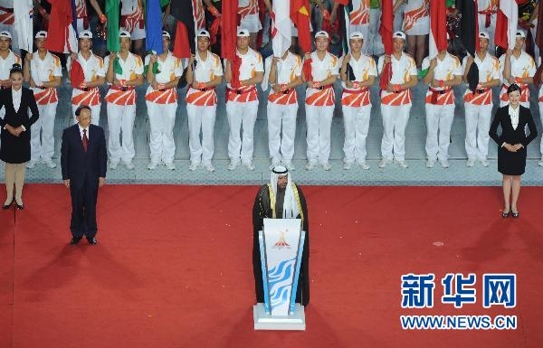 11月27日,亞奧理事會主席艾哈邁德·法赫德·薩巴赫親王(中)致辭。當日,第16屆亞運會閉幕式在廣州市海心沙島舉行。 新華社記者楊磊攝