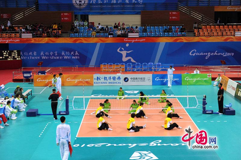 12月13日,廣州2010亞殘運會坐式排球女子預賽,中國隊以3比0戰勝巴基斯坦隊。(中國網 趙娜攝影報道)