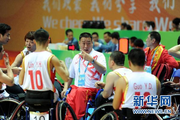 12月14日,中國男子輪椅籃球隊主教練翟永君(中)在對陣阿聯酋隊的比賽中為球員布置戰術。 52歲的翟永君是我國第一批輪椅籃球運動員,曾經的主力國手。中國輪椅籃球的發展,只有短短23年的時間,為了提高此項競技項目的水平,翟永君奉獻了寶貴的23年。新華社記者劉大偉攝