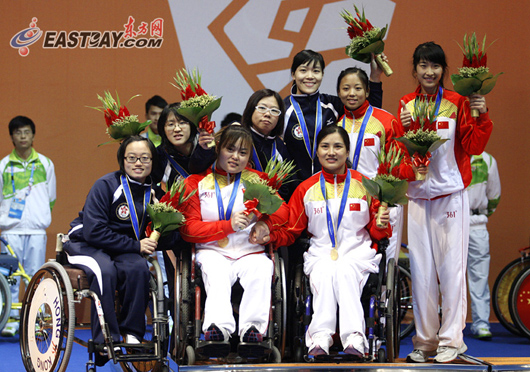 女團(tuán)金銀牌得主中國(guó)隊(duì)與中國(guó)香港隊(duì)合影<點(diǎn)擊查看擊劍決賽高清圖