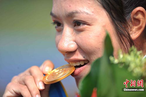 11月23日中午,亞運會女子公路個人賽頒獎儀式上,獲得金牌的中華臺北選手蕭美玉笑銜金牌,眼角還含著淚水。中新社記者 柯小軍 攝