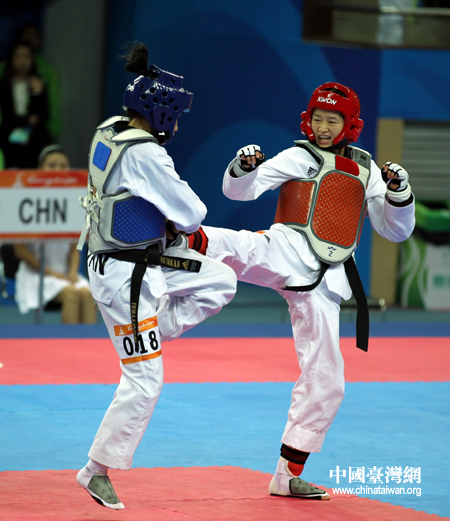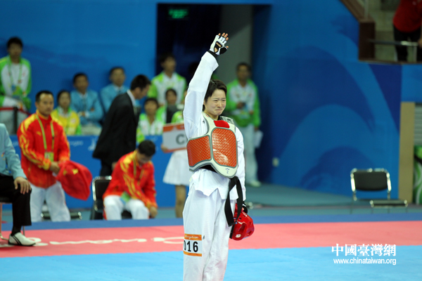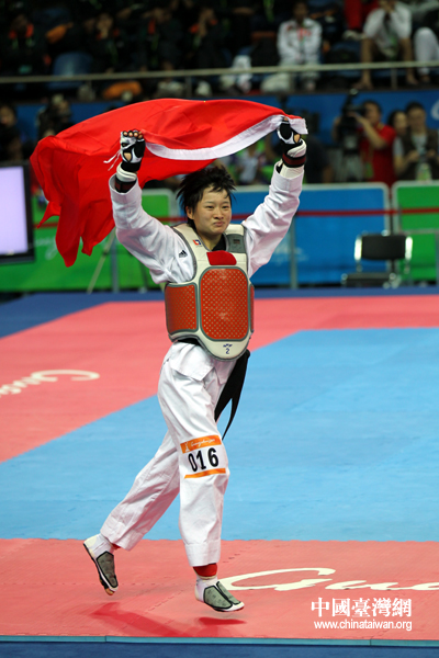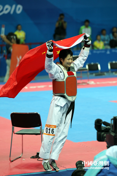 中國臺灣網11月17日廣州消息 2010年廣州亞運會女子跆拳道49公斤級決賽,中國名將吳靜鈺以13:1輕松擊敗日本選手笠原江梨香奪得金牌。賽后,吳靜鈺身披五星紅旗繞場一周向全場觀眾致謝意。(記者 鐘寶華)